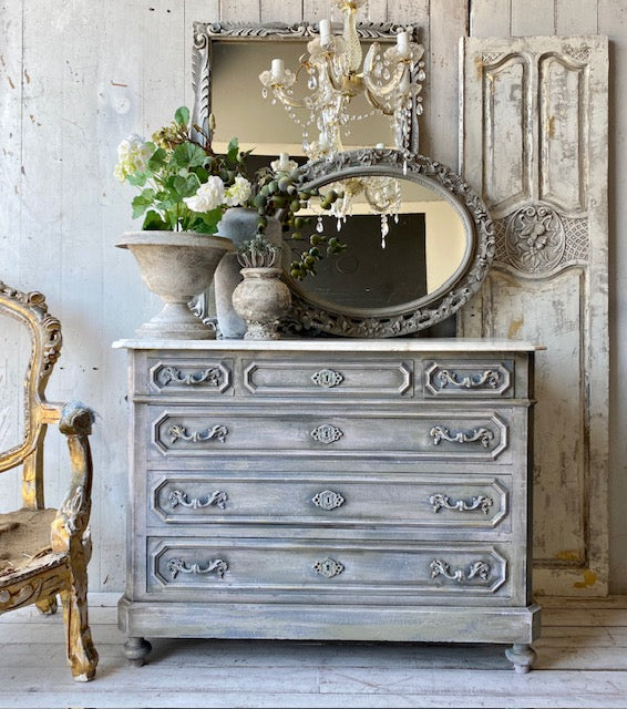 "I painted this sweet cabinet in Annie Sloan Palona. adding the wreath applique for detail. A dry brush of Old White Chalk Paint and a dab or two of white wax brought out the highlights. Paloma is a subtle lilac that I know you will fall in love with!" - Claire