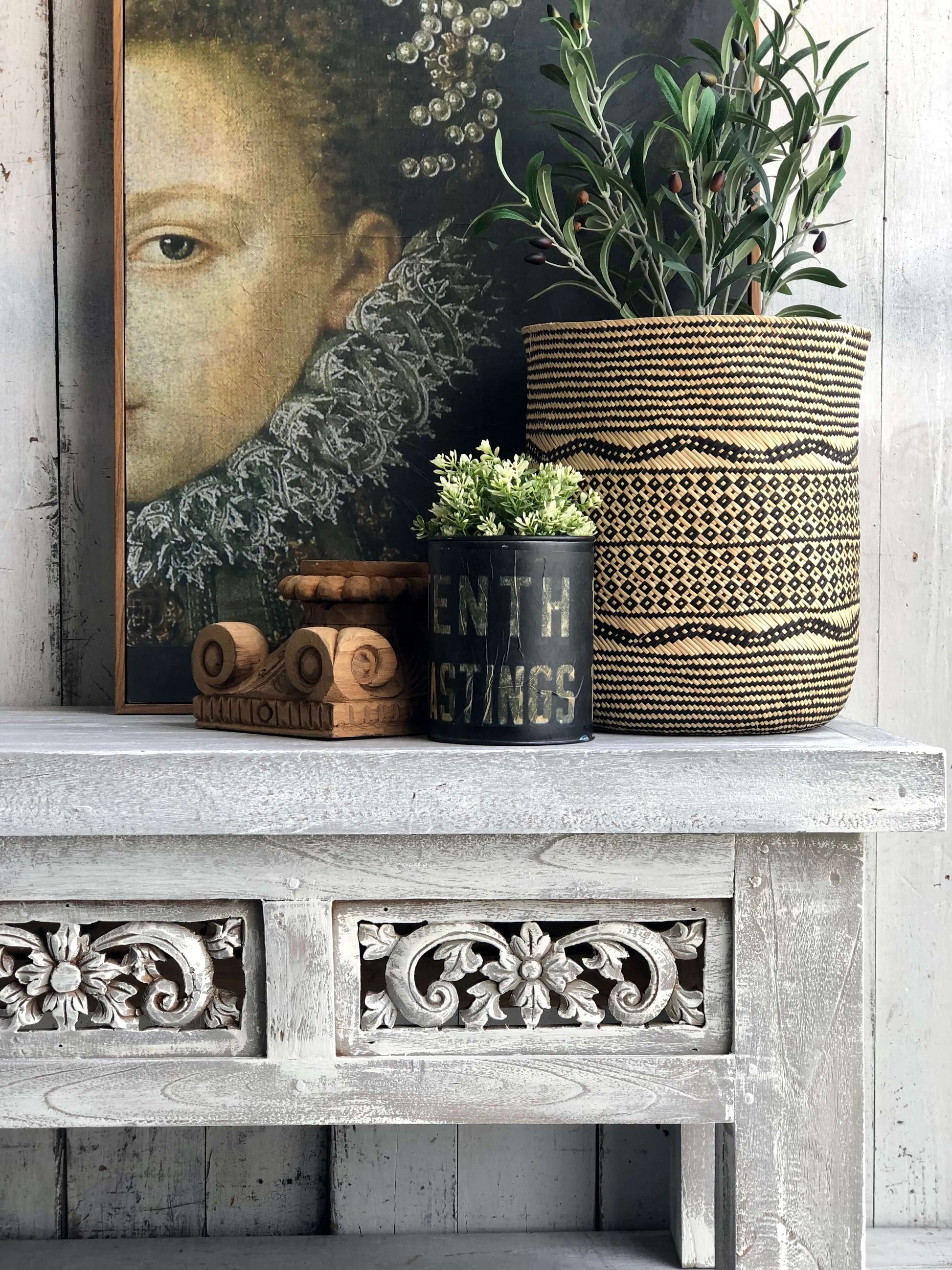 Hand painted with Annie Sloan Chalk Paint. A mix of French Linen, and Old White. Finished with white wax.