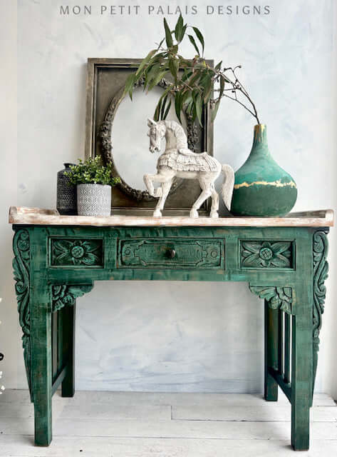 Elevate your space with this Emerald Green Carved Console Table and bring Bohemian flair into your home today!