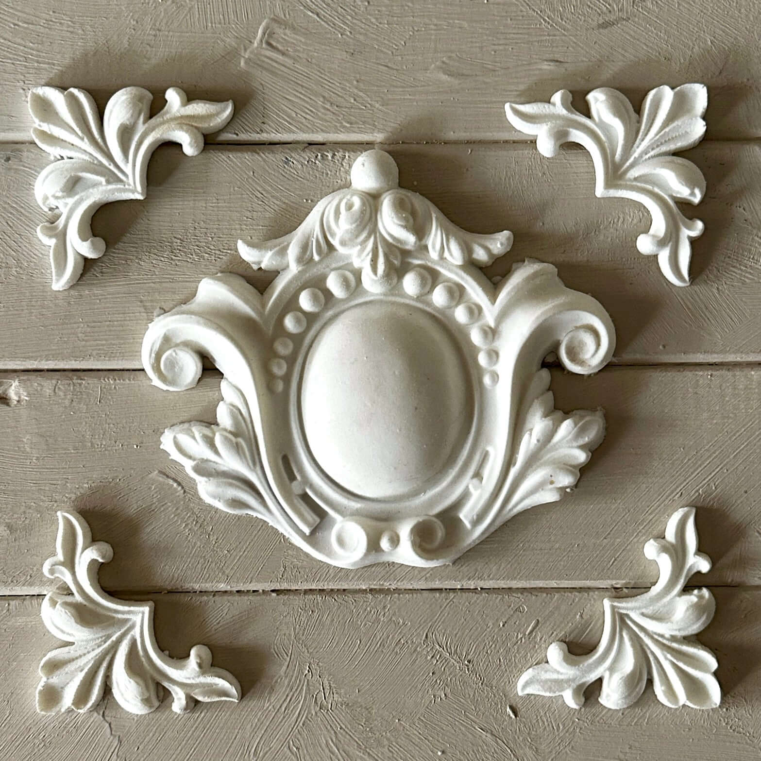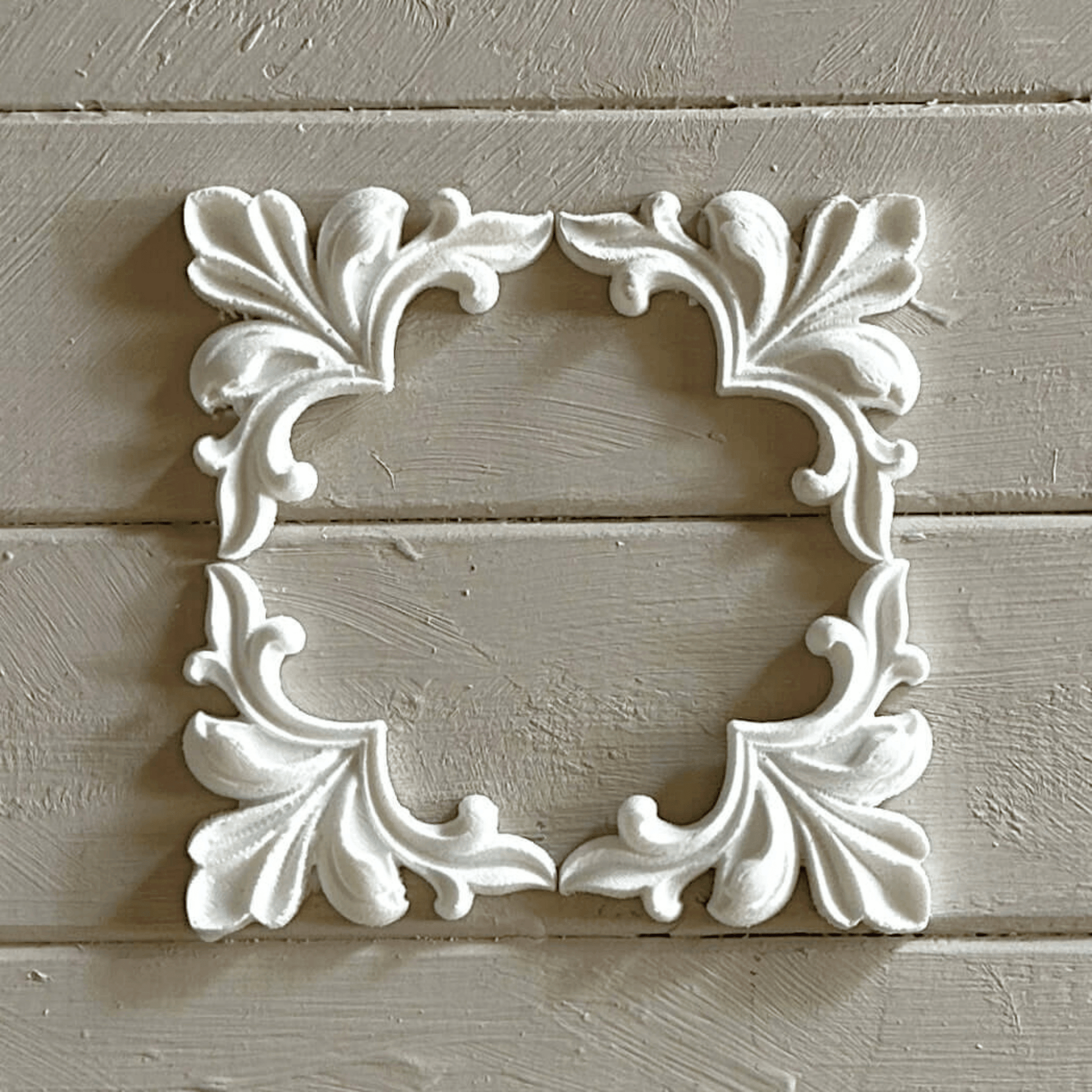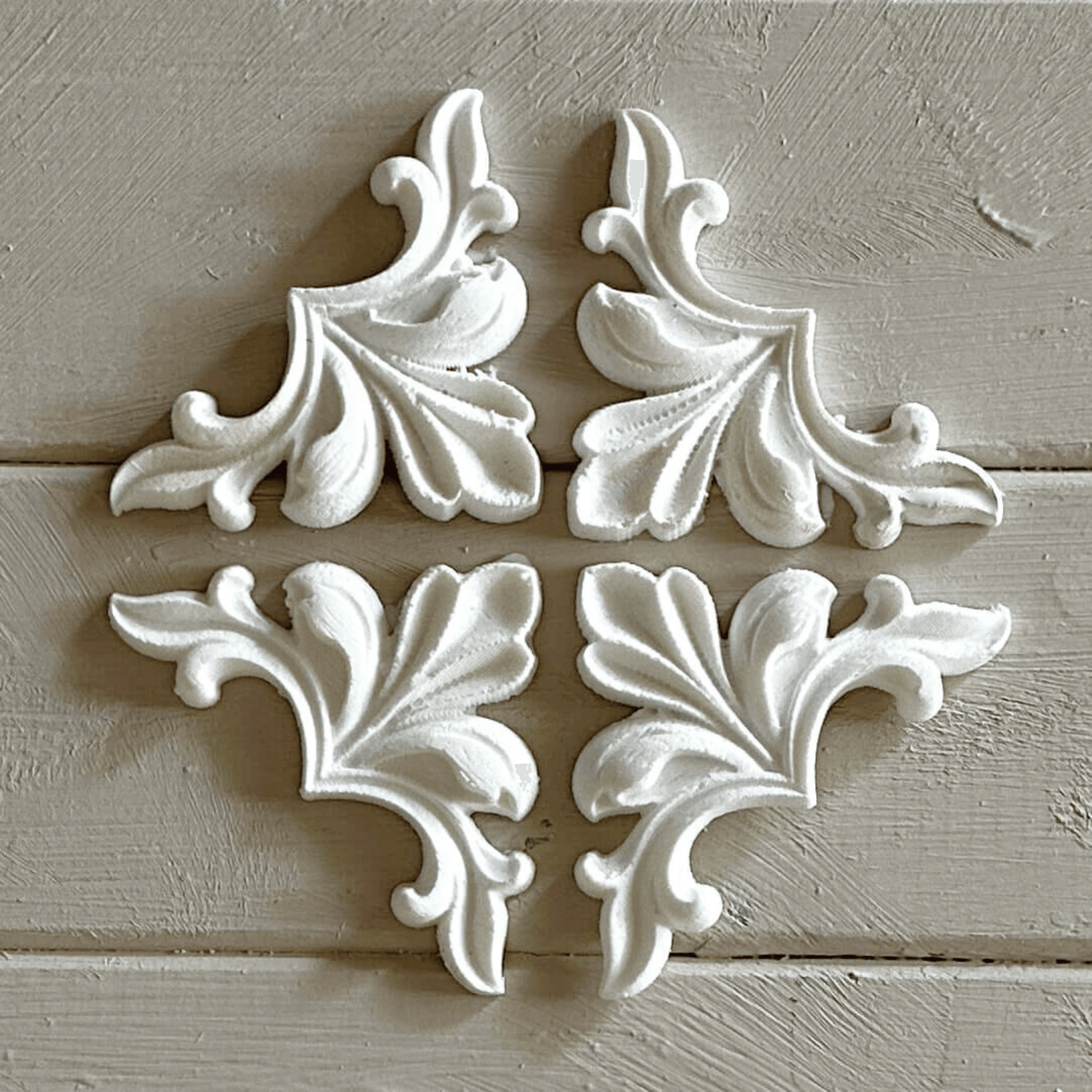 Use a single piece as a gentle accent, a pair on the bottom corners of a drawer, or all four corners on a cabinet door for a framed, custom look. You can also use a set of four to create a pretty frame around another appliqué, as shown in the example image.