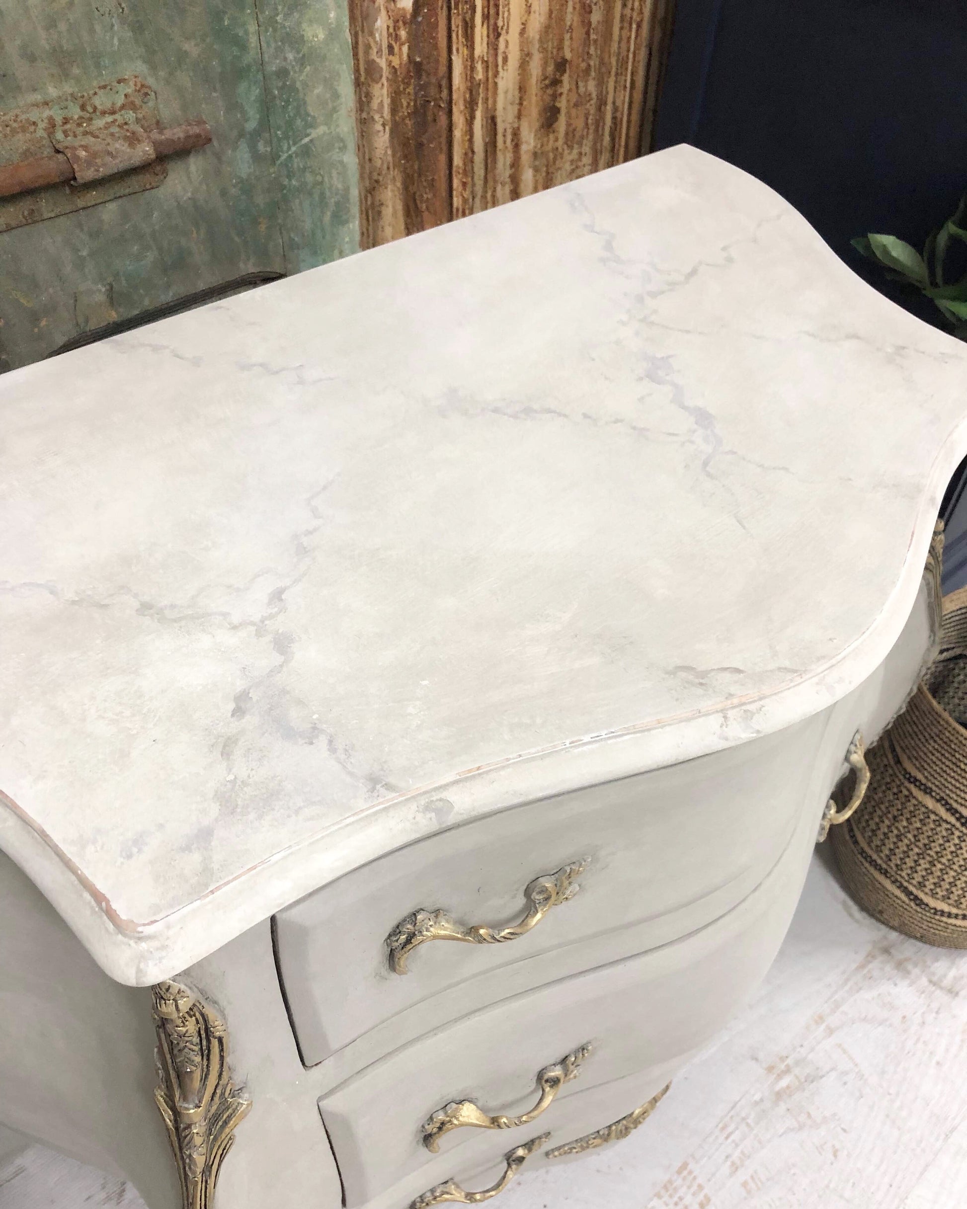 Stunning drawers, hand painted with Annie Sloan Chalk Paint for so much character. Featured on Annie Sloan Australia. Beautiful ornate detail and a marble topped finish. Elegant and graceful for any home.