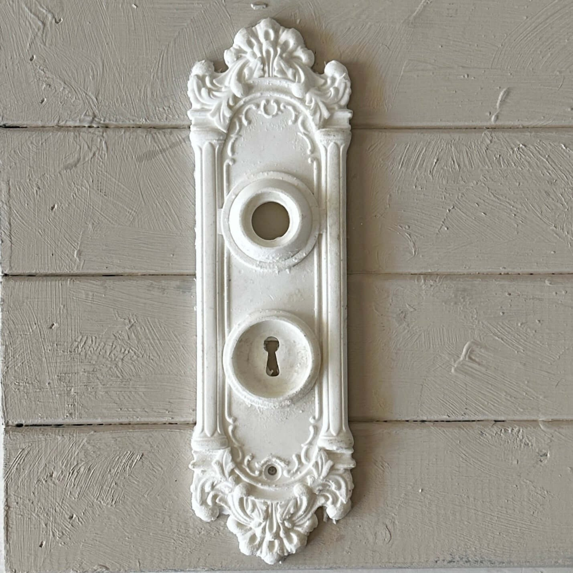 Add a refined, vintage-inspired base to your knobs or handles with the Backplate 001 applique. Crafted from durable resin, this elongated escutcheon features ornate detailing and dual keyhole placements—perfect for drawers, cabinets, and upcycled furniture.