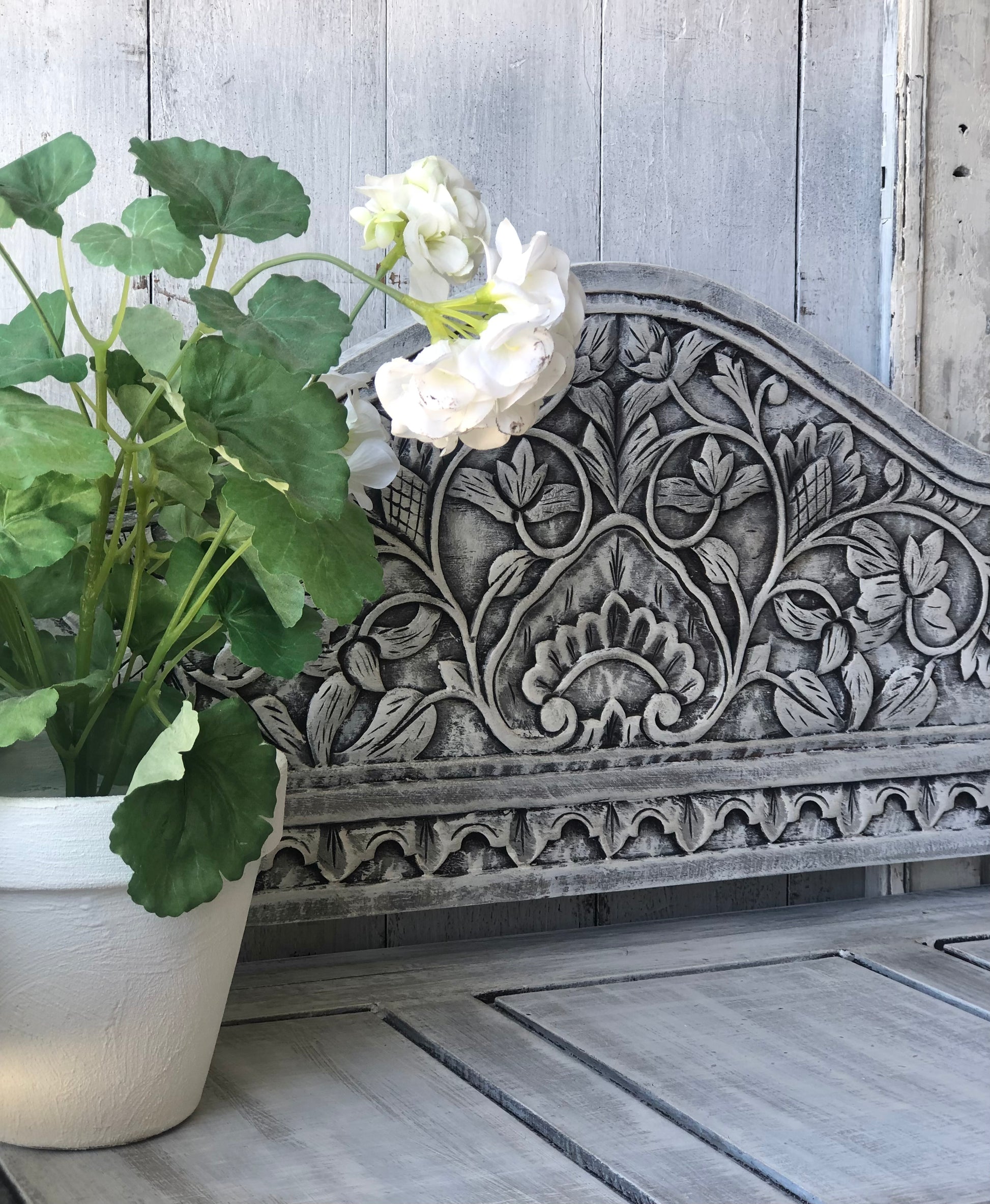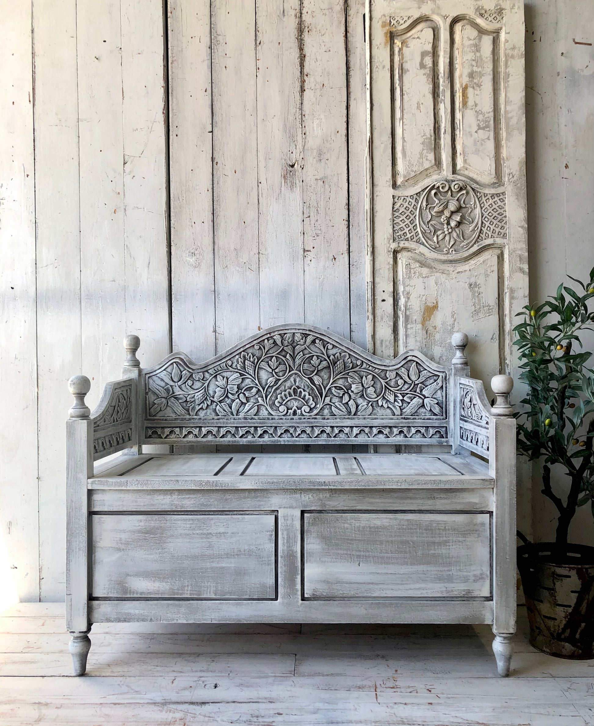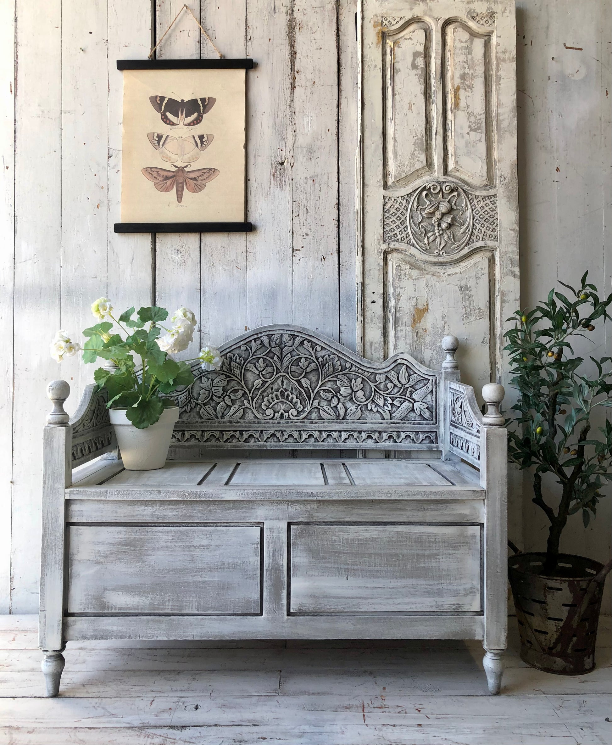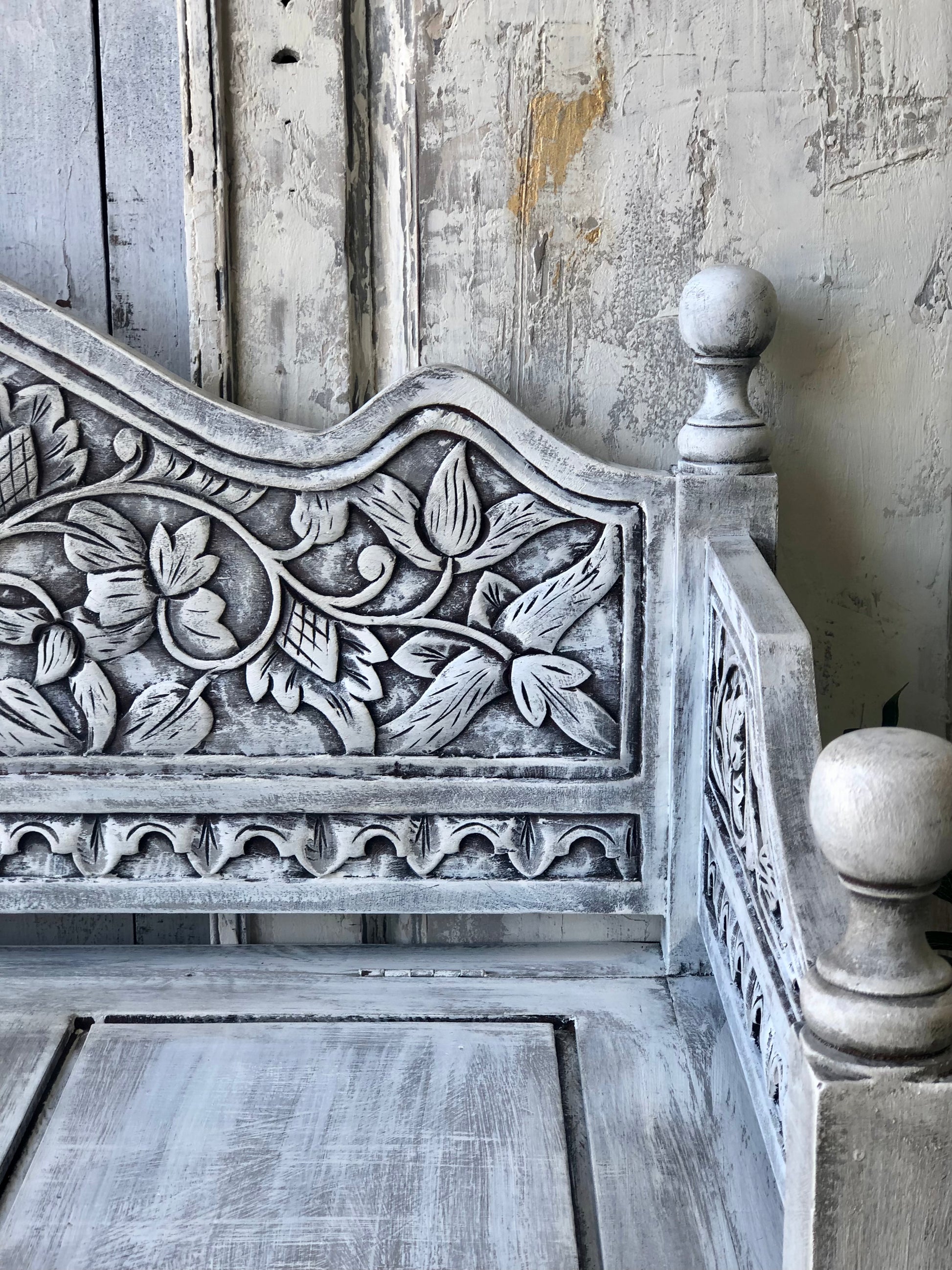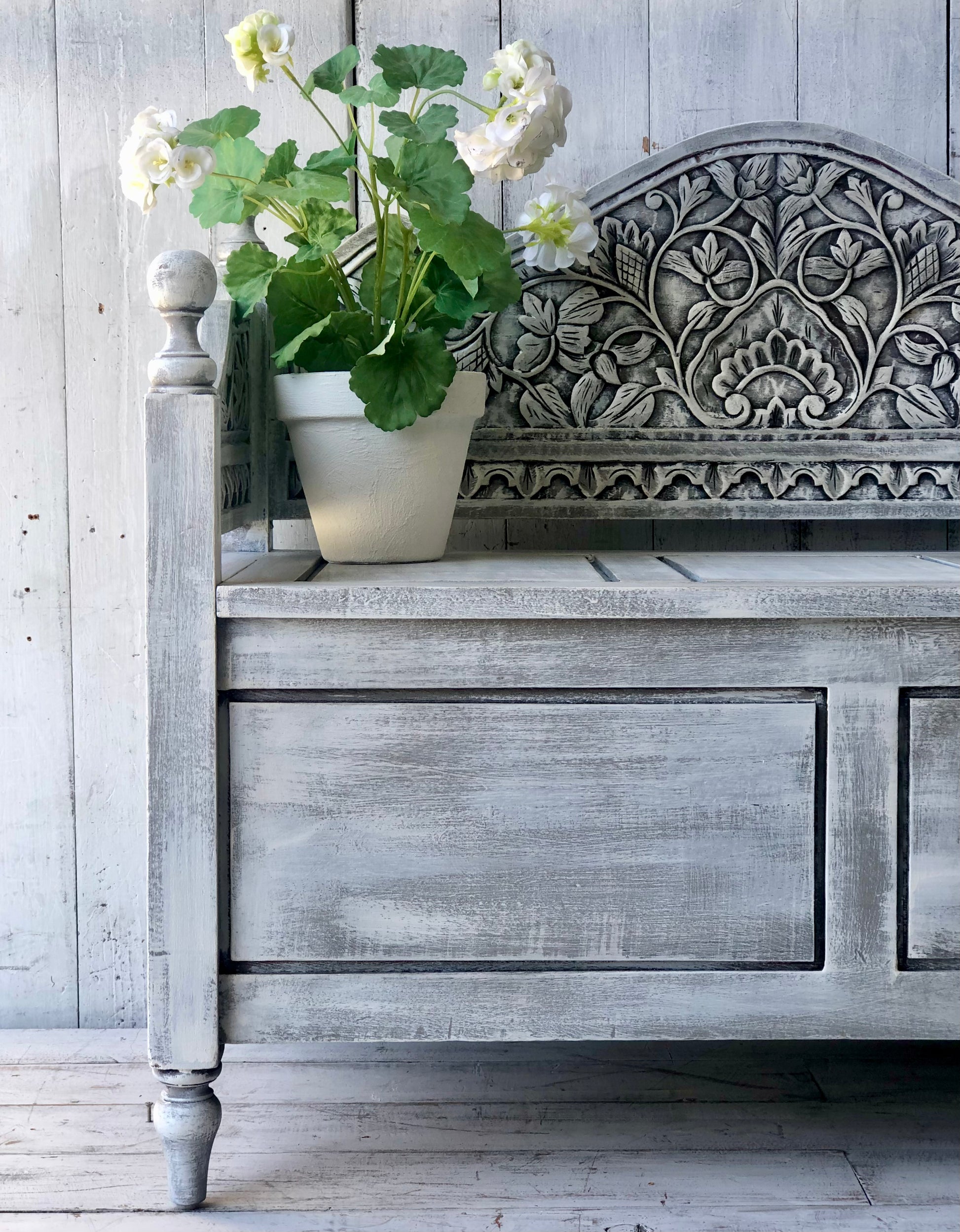 This carved bench seat has been brought to life with layers of Annie Sloan French Linen and Old White Chalk Paint. Finished with Clear Wax and Black and Dark Wax for wonderful vintage loved feel enhancing the intricate carving.