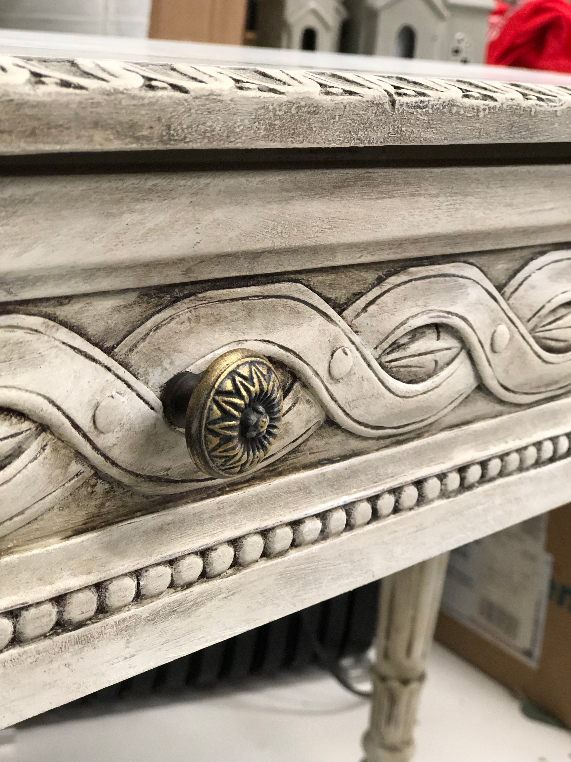 Hand painted with Annie Sloan Country Grey, Old White and Pure White. Then finished with Annie Sloan waxes.