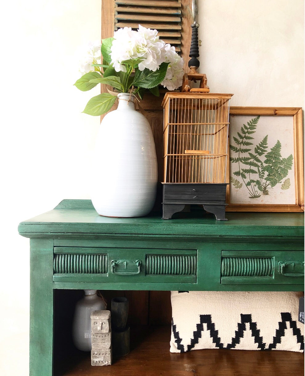 Hand painted with Annie Sloan Amsterdam Green Chalk paint and finished with a dark wax.